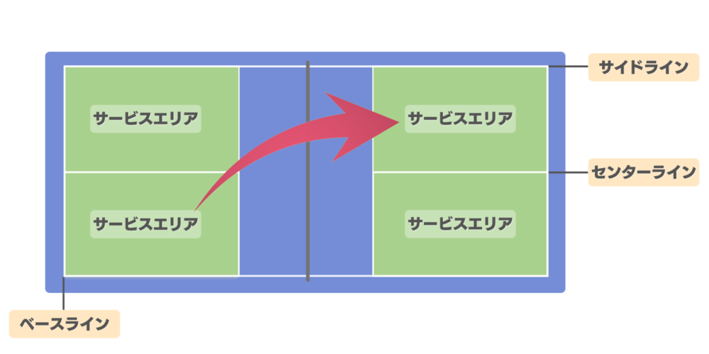 なお、サーブの際は両足がベースラインより後ろの地面に着いた状態で行い、サイドラインとセンターラインの間に収まっていなければいけません。